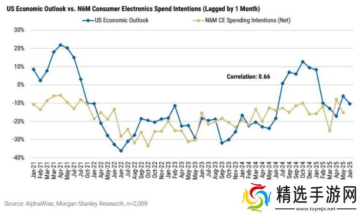 摩根士丹利在报告中指出,美国消费者的经济前景仍然充满变数,消费电子产品的市场前景在未来六个月内预计将更加严峻。这一结论得到了多项数据的支持,包括消费者情绪恶化、支出意愿下降以及关税带来的负面影响等。报告中还包含了一系列图表和数据,如美国经济前景与未来六个月消费电子支出意愿之间的正相关关系(相关系数为0.66),以及密歇根大学消费者信心指数与AlphaWise消费者调查的对比等,这些图表和数据为理解当前美国消费电子市场的现状提供了有力依据。
