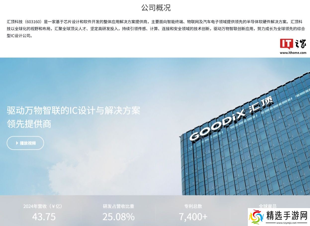 本站查询获悉,汇顶科技是一家基于芯片设计和软件开发的整体应用解决方案提供商,主要面向智能终端、物联网及汽车电子领域提供领先的半导体软硬件解决方案。该公司 2024 年营收 43.75 亿元、研发占营收比重 25.08%、专利总数 7400+、全球雇员 1400。另外,其超声波指纹传感器在 vivo、小米、iQOO、REDMI、一加等国内手机品牌客户实现大规模商用,全年出货量超 800 万颗。
