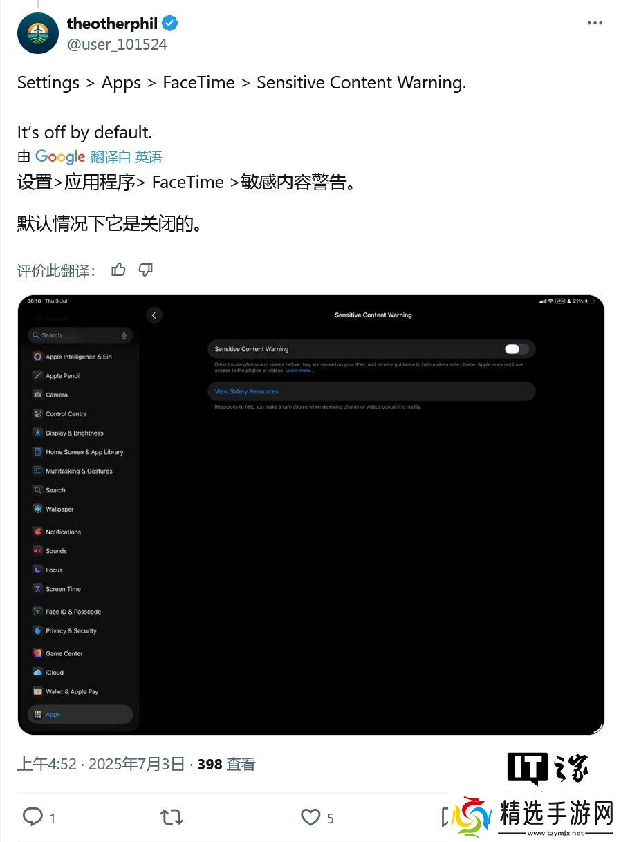 本站援引博文介绍,苹果公司提供的通信安全功能之一,就是干预 FaceTime 视频通话中的裸露内容,不过此前主要适用于儿童,此外还会在“照片”应用中的共享相册中模糊处理裸露内容。