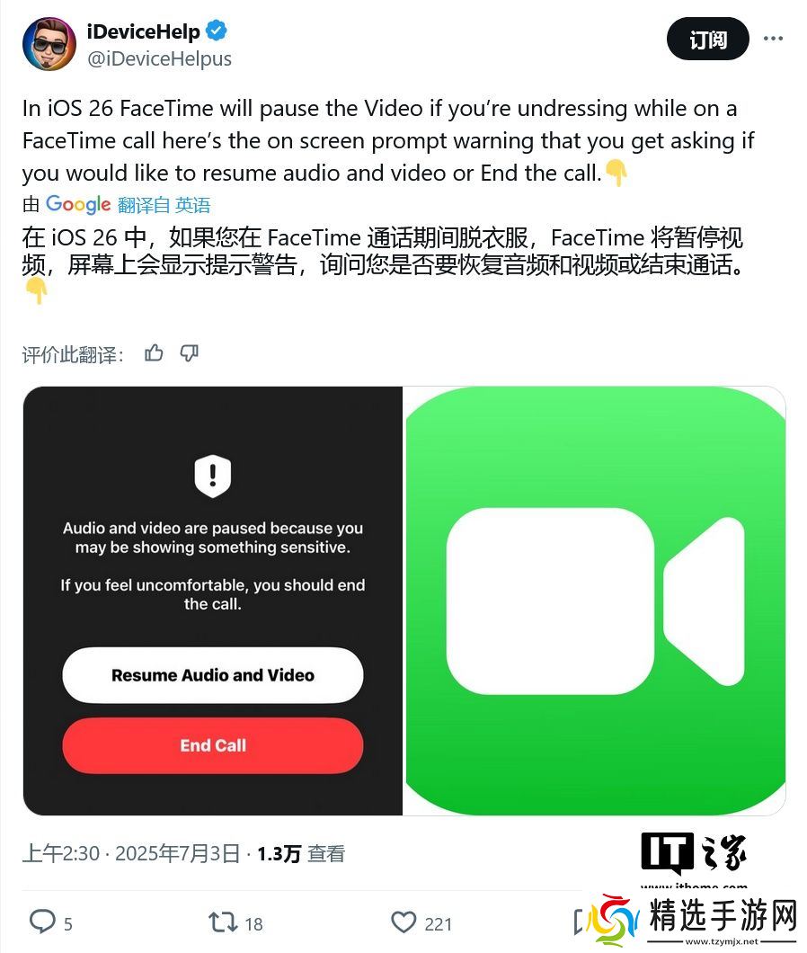 本站 7 月 3 日消息,科技媒体 9to5Mac 昨日(7 月 2 日)发布博文,报道称 iOS 26 在引入“液态玻璃”设计的同时,在功能方面,进一步增强了 FaceTime 体验,在检测到脱衣裸露行为后,会暂停视频和音频通话。