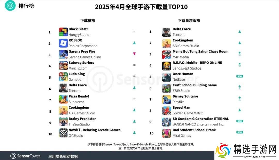 在下载榜方面,《Block Blast!》继续蝉联冠军,展现了其强大的用户吸引力。而《ROBLOX》则凭借出色的表现上升至第二位,紧随其后的是《Free Fire》、《Subway Surfers》以及《Ludo King》,它们共同构成了4月全球手游下载榜的前五强。