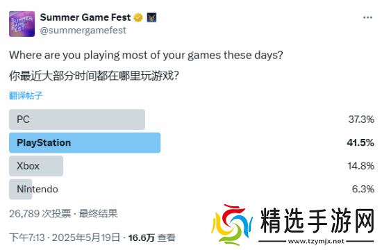 投票结果显示,PlayStation平台以41.5%的占比高居榜首,成为最受玩家青睐的游戏平台。紧随其后的是PC平台,获得了37.3%玩家的支持。相比之下,Xbox平台则收获了14.8%的选票,而任天堂平台则以6.3%的占比位列末位。