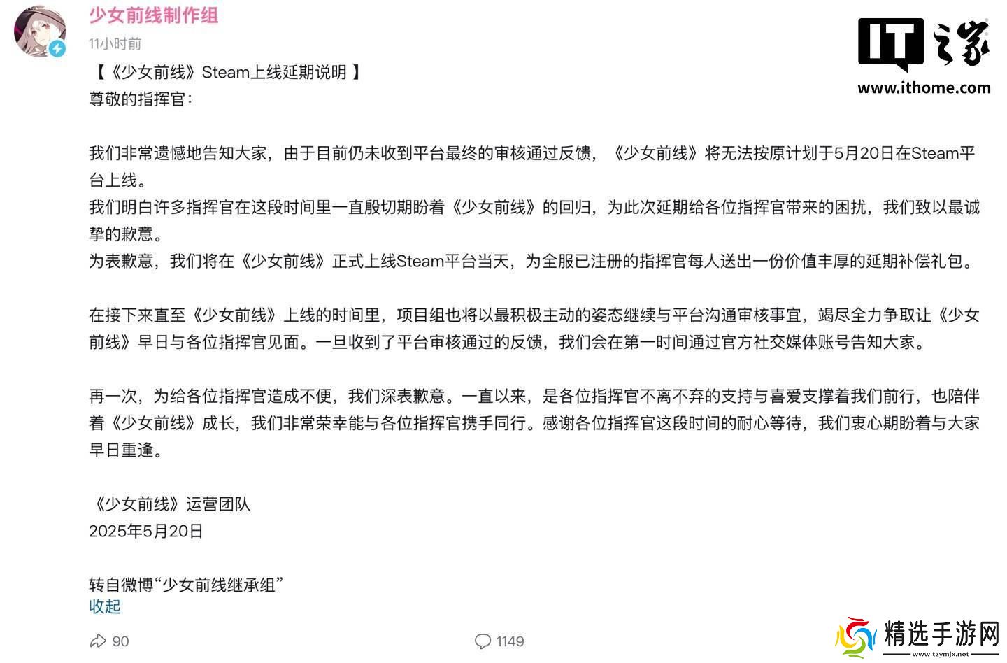 近日,《少女前线》官方在B站发布了一则重要通知,关于该游戏在Steam平台上线的时间有所变动。原本计划在2025年5月20日推出的“继承版”,因尚未获得平台的最终审核通过,将无法如期上线。