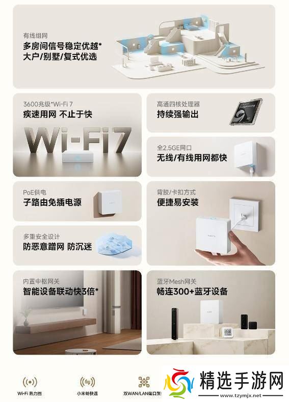 通过米家App,用户可以对儿童使用的设备进行精细化的管理,包括限制游戏、视频、社交及支付类App的使用时长,并过滤掉危险的网站。在智能化方面,这款路由系统兼容小米澎湃智联技术,支持本地化智能指令的运行,即使在断网的情况下也能进行操控。内置的蓝牙Mesh网关则可以连接超过300台蓝牙设备,为用户提供全方位的智能家居体验。