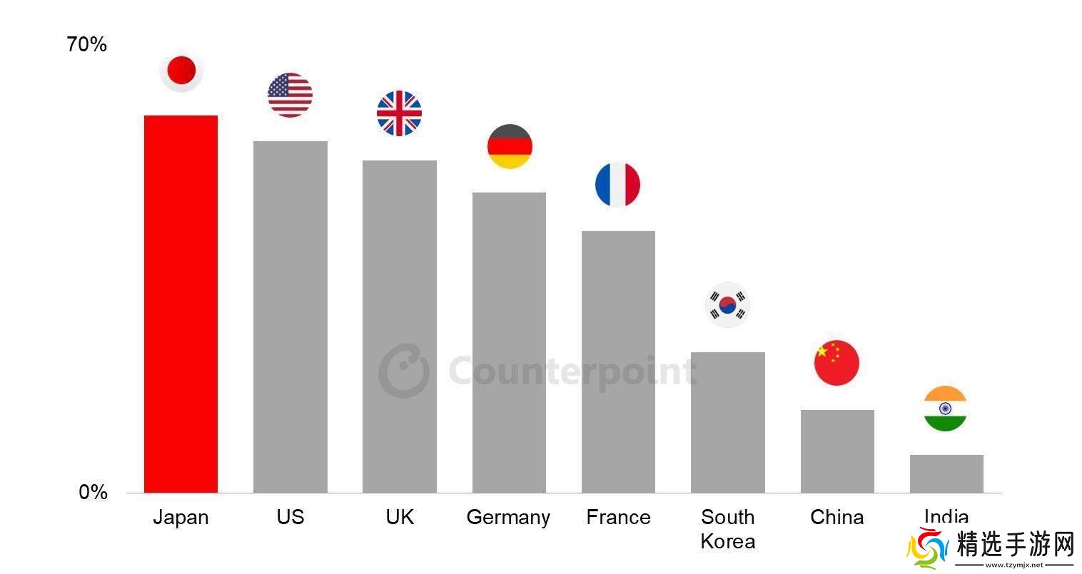值得注意的是,苹果在日本市场的份额相较于其他主要国家,尤其是亚洲国家,显得尤为突出。CounterPoint Research在报告中分享了苹果iPhone在全球主要市场的市场份额数据,尽管具体数值未提及,但苹果在日本的高市场份额无疑为其持续增长奠定了坚实基础。