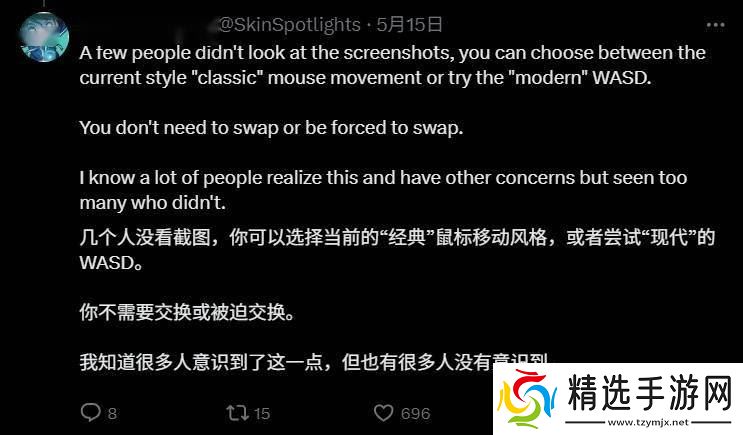 值得注意的是,WASD操作模式并非针对某个特定游戏模式推出,而是作为面向所有玩家的一个可选功能。这意味着,无论玩家是在进行常规对战、排位赛还是其他任何游戏模式,都可以自由选择使用这一新的操作模式。