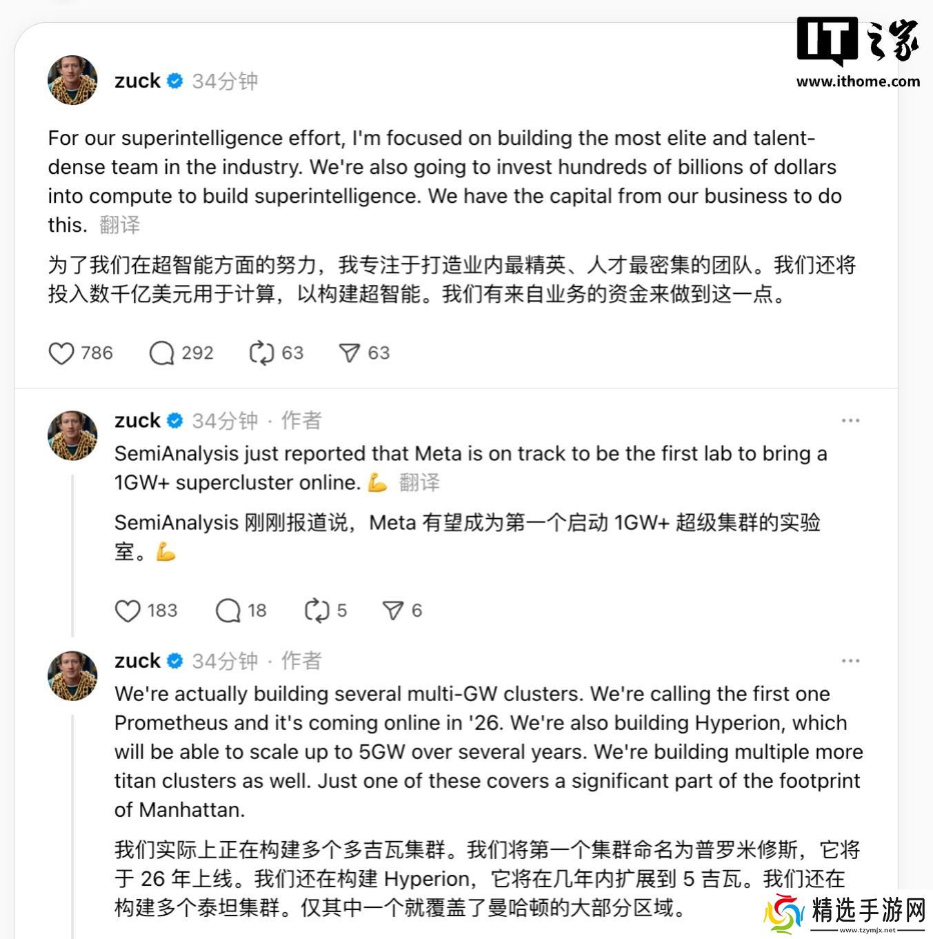 这项声明发布之际,科技巨头们正竞相进行高调收购,并开出数百万美元年薪的薪酬方案,只为吸引人工智能领域的顶尖人才,争夺下一代 AI 技术的主导权。扎克伯格在社交平台 Threads 上发帖称:“我们有来自业务的资金来实现这一目标。”