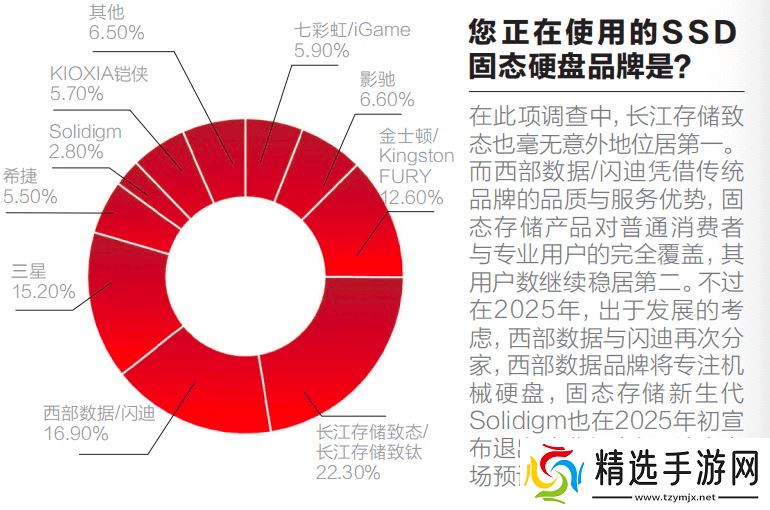 在2024年的调查中,致态品牌的表现尤为抢眼。数据显示,37.9%的用户将致态列为他们的首选SSD品牌,相比上一年度提升了11.8个百分点。22.3%的用户正在使用致态固态硬盘,这一比例远超其他存储品牌,凸显了致态在市场上的强劲竞争力。致态品牌不仅在用户心中占据重要地位,在实际销量方面也名列前茅。