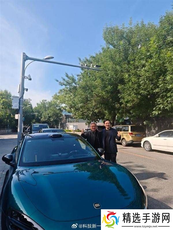 在一座古色古香的建筑前,雷军与黄仁勋并肩而立,面带微笑,背景映衬着传统与现代交融的美景。随后,另一张照片也浮出水面,画面中两人站在小米最新款SU7 Ultra手机旁,对着镜头竖起大拇指,气氛和谐而愉快。
