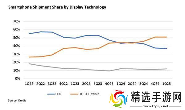 最新的智能手机市场追踪数据显示,AMOLED显示面板在智能手机领域的应用正迅速扩大其影响力。据Omdia发布的报告指出,截至2025年第一季度,全球智能手机出货量中,搭载AMOLED面板的机型占比已高达63%,与去年同期的57%相比,有了显著提升。