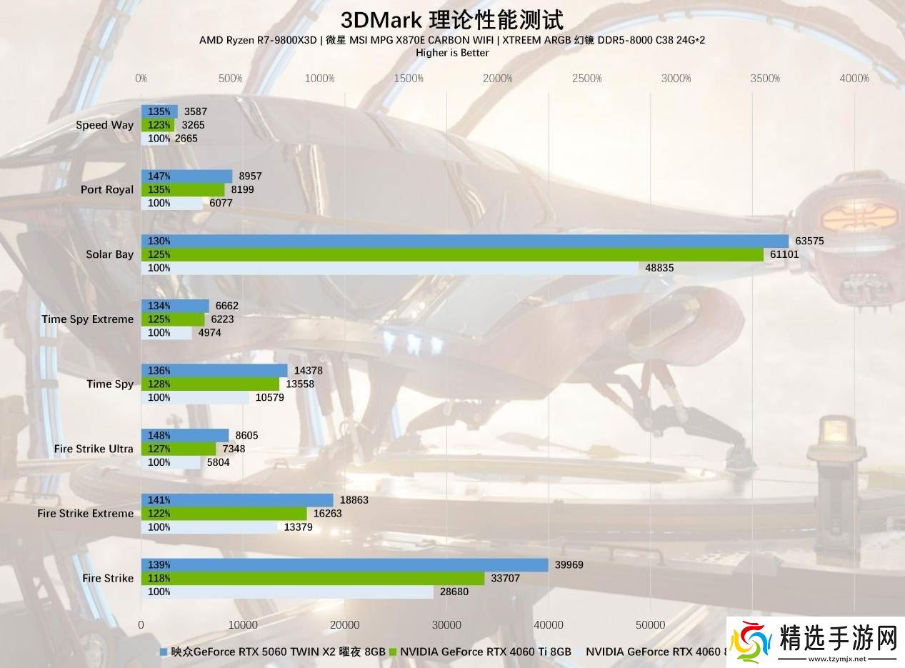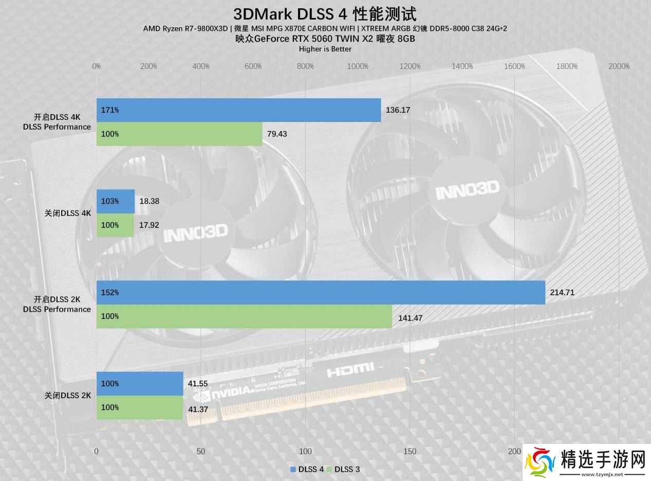 在测试平台上,我们使用锐龙R9 9800X3D处理器配合微星MPG X870E CARBON WIFI主板,并在BIOS中开启PBO功能与X3D处理器模式。测试显卡包括RTX 4060 8GB、RTX 4060 Ti 8GB以及映众RTX5060曜夜8GB。