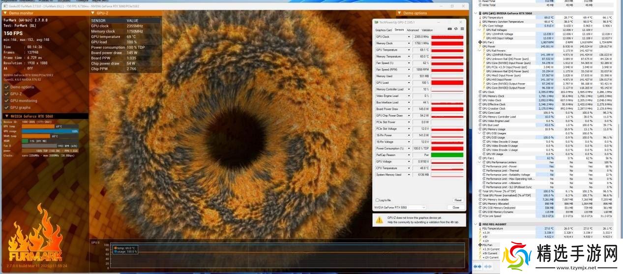 最后,在功耗与温度测试中,映众RTX5060曜夜表现出色。在室温23℃下,Furmark烧机10分钟后,显卡核心温度仅为69度出头,显存温度低于60度,功耗为145W。风扇转速为1899 RPM,噪音与温度控制良好。