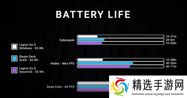 除了游戏性能,SteamOS在电池续航方面的表现同样令人印象深刻。在轻量级游戏如《哈迪斯》和《死亡细胞》的测试中,SteamOS的续航时间分别比Windows 11增加了2小时和3小时,几乎达到了Windows 11的两倍。即使在《赛博朋克2077》这样的高负载游戏中,SteamOS也能提供长达1小时54分钟的续航时间,比Windows 11的1小时31分钟提升了25%。