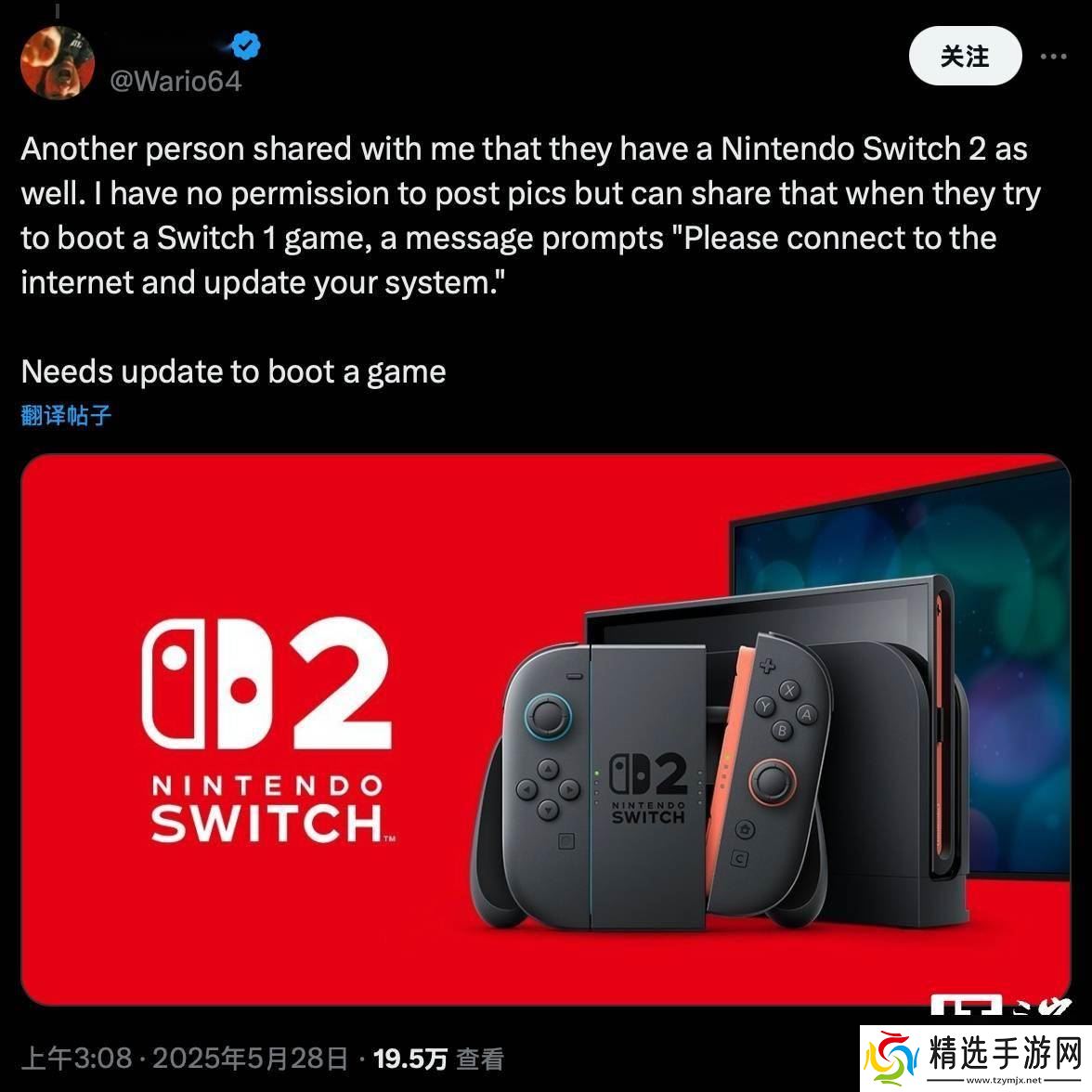 随后,转发该视频的爆料人Wario64进一步补充了信息。据称,尽管用户能够进入Switch 2的主界面,但无论是初代Switch还是Switch 2的游戏都无法直接运行。当尝试启动游戏时,系统会提示“请连接至互联网更新系统”,这意味着需要等待首日更新补丁的发布才能正常使用。