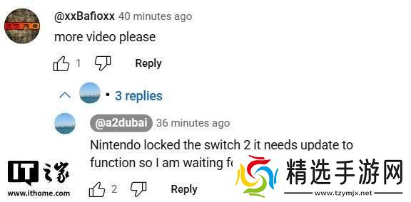 在这段由用户a2dubai上传并随后删除的视频中,Switch 2主机及其Joy-Con手柄的部分细节清晰可见。尽管视频时长有限,未能展示完整的开箱过程,但已经足以激发网友们的好奇心。当网友们纷纷在评论区要求更多画面时,a2dubai透露,该主机目前处于锁定状态,需要等到6月5日才能正式使用。