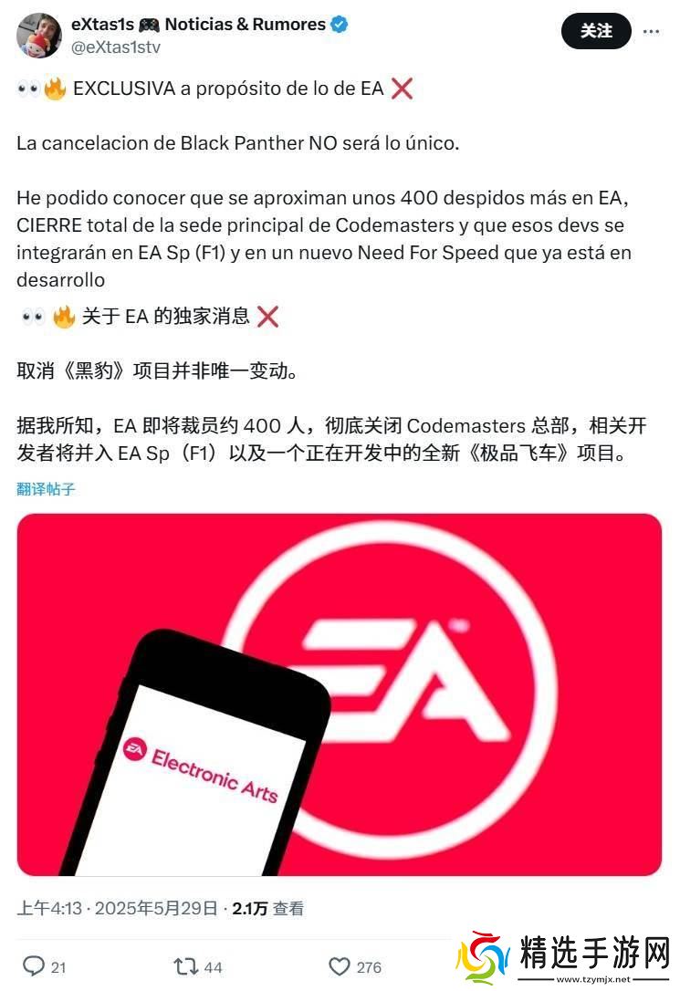 此次关闭工作室的消息紧随EA旗下Respawn Entertainment的大规模裁员之后,该工作室约300至400名员工被裁撤。而据业内消息人士eXtas1s透露,EA的裁员风暴似乎还未平息,有传言称EA可能计划关闭Codemasters的总部,并裁掉大约400名开发人员。