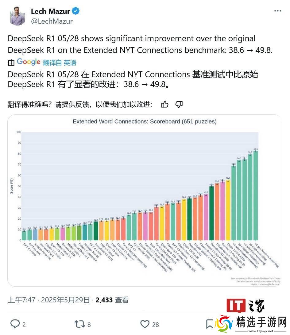 除了编程能力,DeepSeek-R1-0528在Extended NYT Connections基准测试中也取得了不俗的成绩。该测试基于《纽约时报》的Connections谜题游戏,旨在评估大型语言模型的语言理解和推理能力。DeepSeek-R1-0528的跑分达到了49.8分,相较于初代Deepseek R1模型的38.6分,有了显著提升。