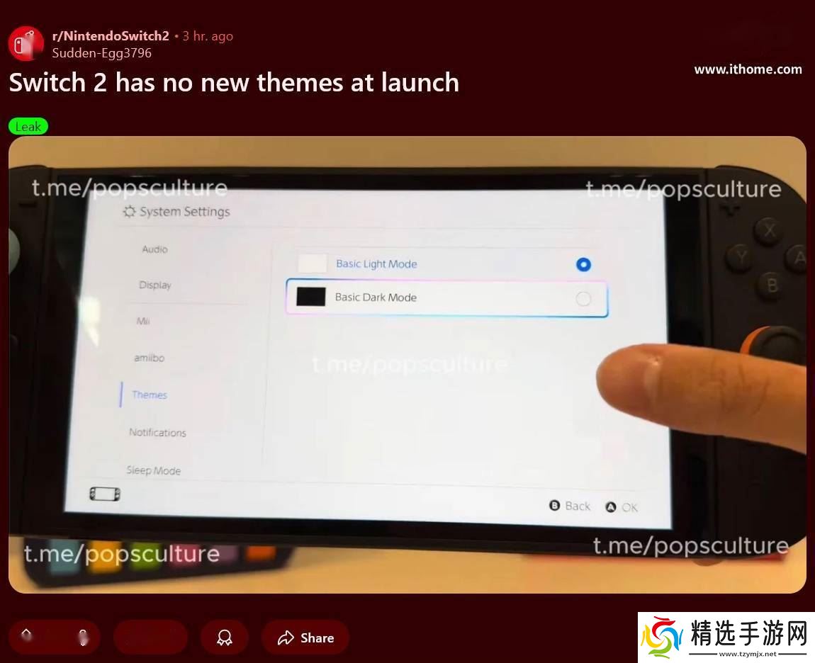 在Reddit论坛上流传的该开箱视频截图显示,Switch 2的系统设置中,“主题”选项下仅提供了基础的浅色模式和深色模式,这让不少期待个性化界面的玩家感到略失所望。然而,这一局限性似乎只是暂时的。