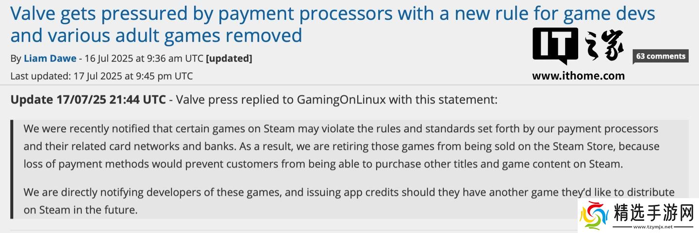 本站注意到,目前V社已对外媒 GamingOnLinux 进行回应,表示相应情况系支付渠道 / 卡组织要求:
