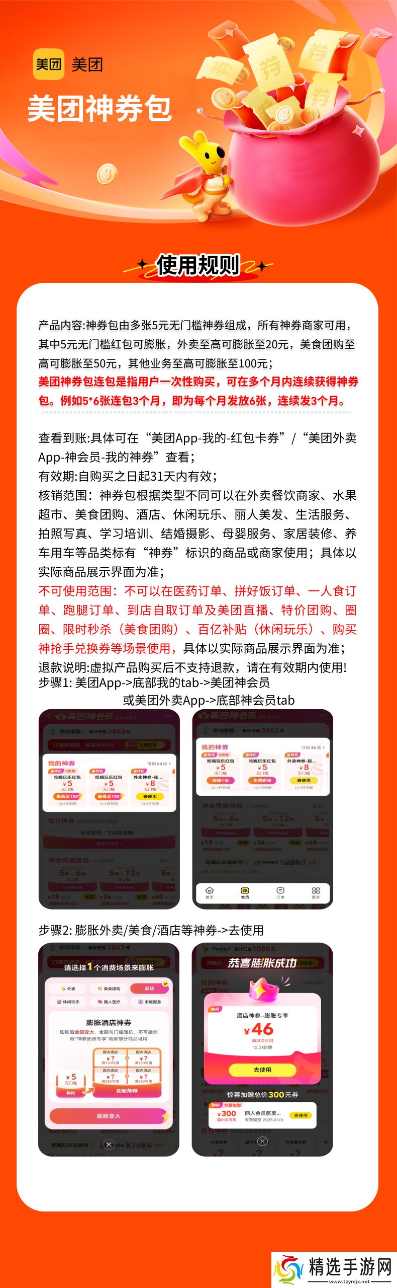 美团 5 元神券吃喝玩乐都能用(包括剪发烫头温泉泡澡),同时还支持免费膨胀,且支持至高膨胀到 100 元,普通会员 6 张日常 2.99 元。