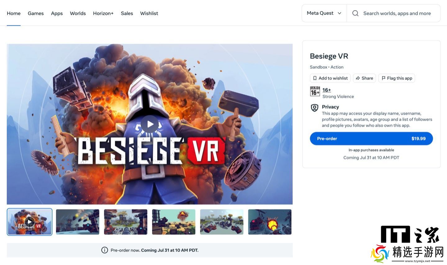 本站 7 月 20 日消息,开发商 Spiderling Studios 宣布旗下经典策略物理游戏《围攻(Besiege)》将于 7 月 31 日登陆 Meta Quest VR 平台,定价 19.99 美元(本站注:现汇率约合 143.5 元人民币),本站附游戏商品页如下(https://www.meta.com/experiences/besiege-vr/8981075088581523/)。