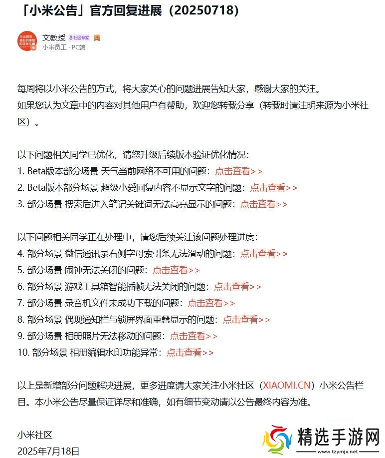 本站 7 月 20 日消息,小米员工本周(7 月 18 日)在小米社区发布公告,对小米澎湃 HyperOS 问题处理进展进行公布,其中提到了 Beta 版本部分场景天气当前网络不可用、超级小爱回复内容不显示文字等问题的优化情况。