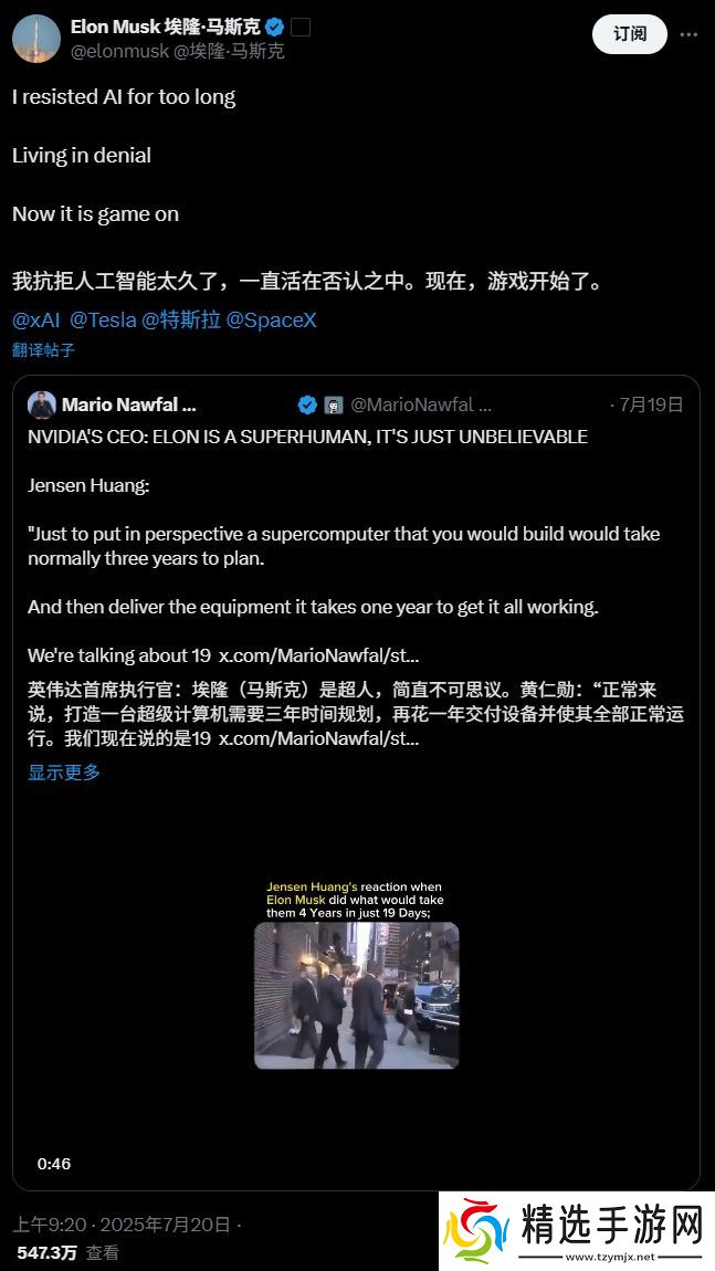 在今日的一条推文中,马斯克称,“我抗拒人工智能太久了,一直活在否认之中。现在,游戏开始了。”
