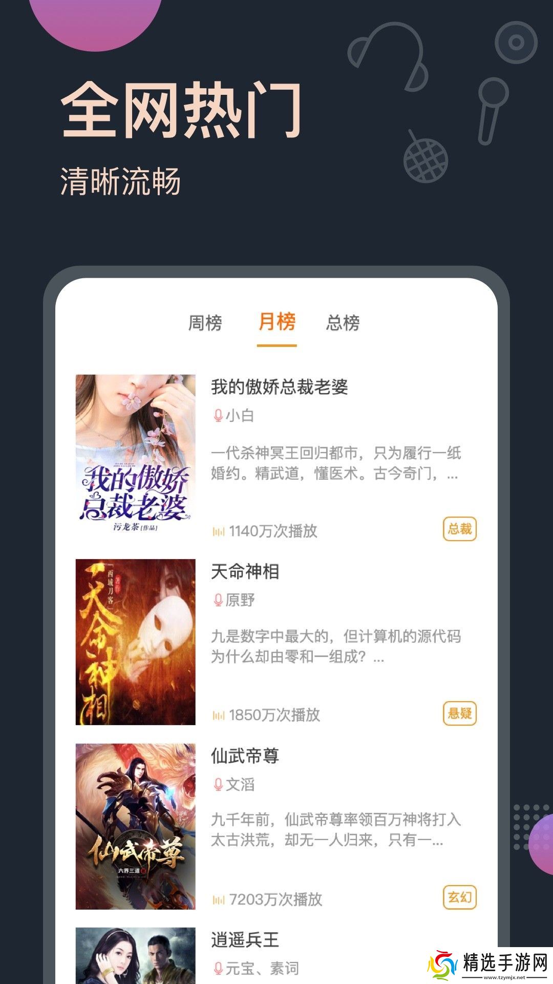 软件功能1.丰富的资源类型:提供了广泛的音频资源库,包括流行小说、经典文学、广播剧、相声、小品等各种类型的内容。