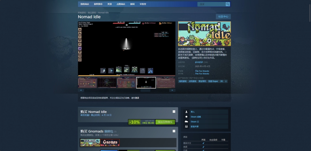 Steam平台需要先安装Steam平台,之后注册一个账号登录,然后搜索“Nomad Idle”进入商店购买页面。