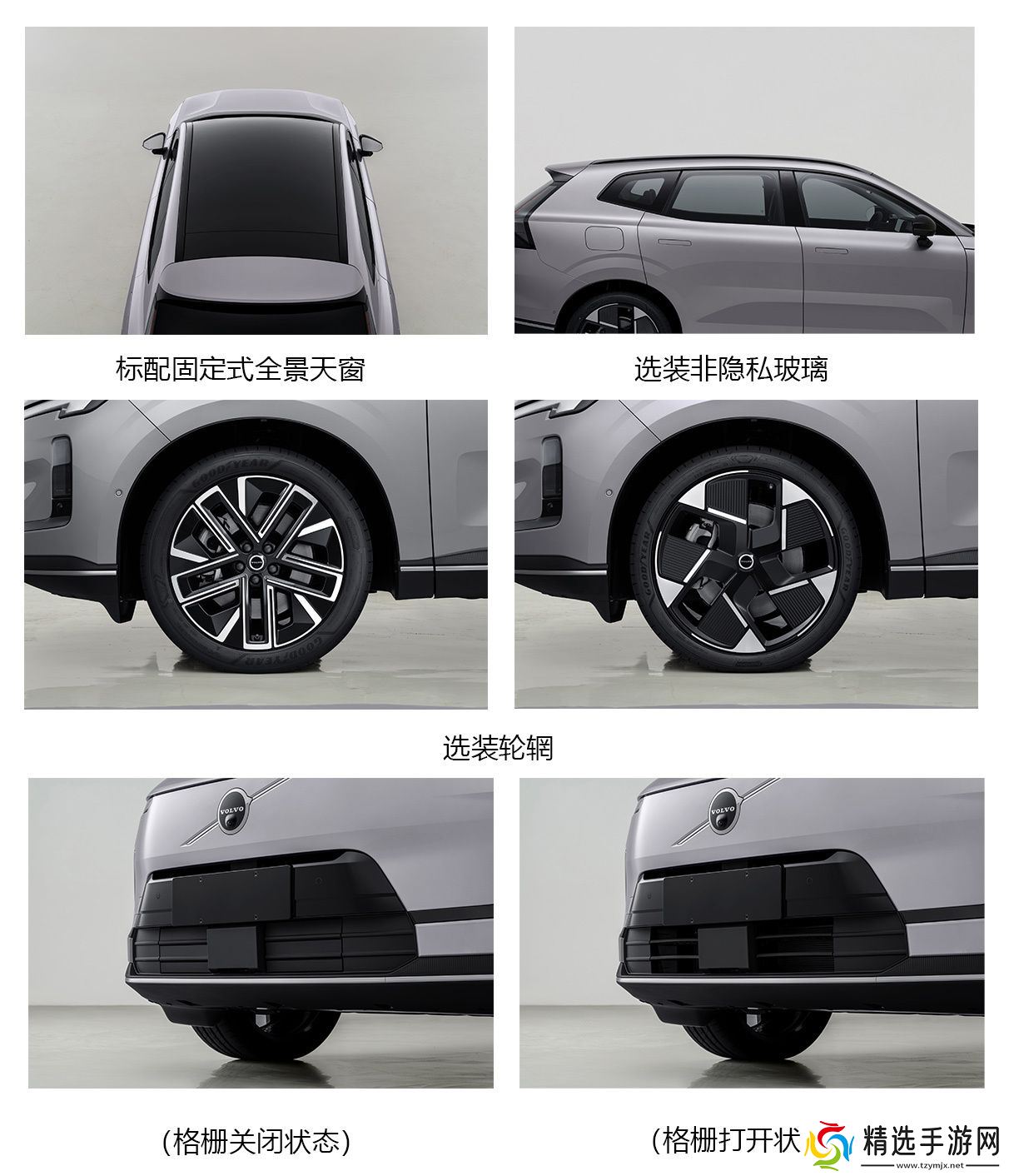 综合工信部申报图和官方海报,该车将提供牛仔蓝、瀚漠沙、霞光灰、松湖绿等车漆配色,车辆前脸采用了沃尔沃标志性的“雷神之锤”LED 大灯和大面积的黑色格栅;车身提供隐藏式门把手;车尾后挡风玻璃的倾斜角度更大,并且尾部采用了 C 形尾灯,与后挡风玻璃融为一体。