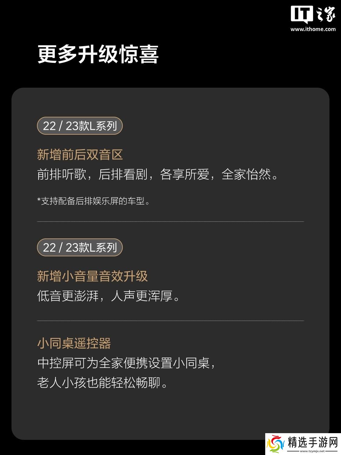 22/23 款 L 系列新增前后双音区,前排听歌,后排看剧,各享所爱,全家怡然。新增小音量音效升级,低音更澎湃,人声更浑厚。小同桌遥控器,中控屏可为全家便携设置小同桌,老人小孩也能轻松畅聊。