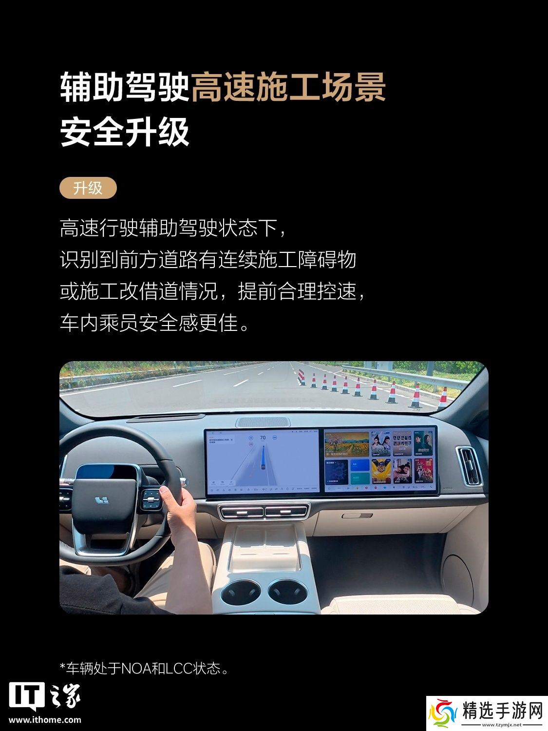 高速行驶辅助驾驶状态下,识别到前方道路有连续施工障碍物或施工改借道情况,提前合理控速,车内乘员安全感更佳。该功能适用于车辆处于 NOA 和 LCC 状态。