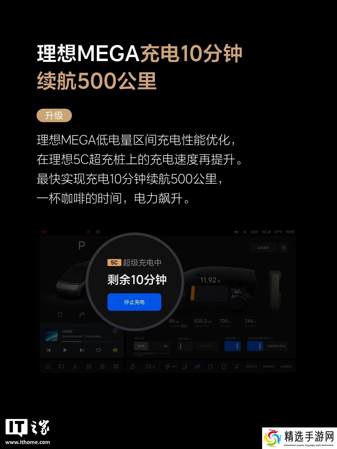 理想 MEGA 低电量区间充电性能优化,在理想 5C 超充桩上的充电速度再提升。最快实现充电 10 分钟续航 500 公里,一杯咖啡的时间,电力飙升。
