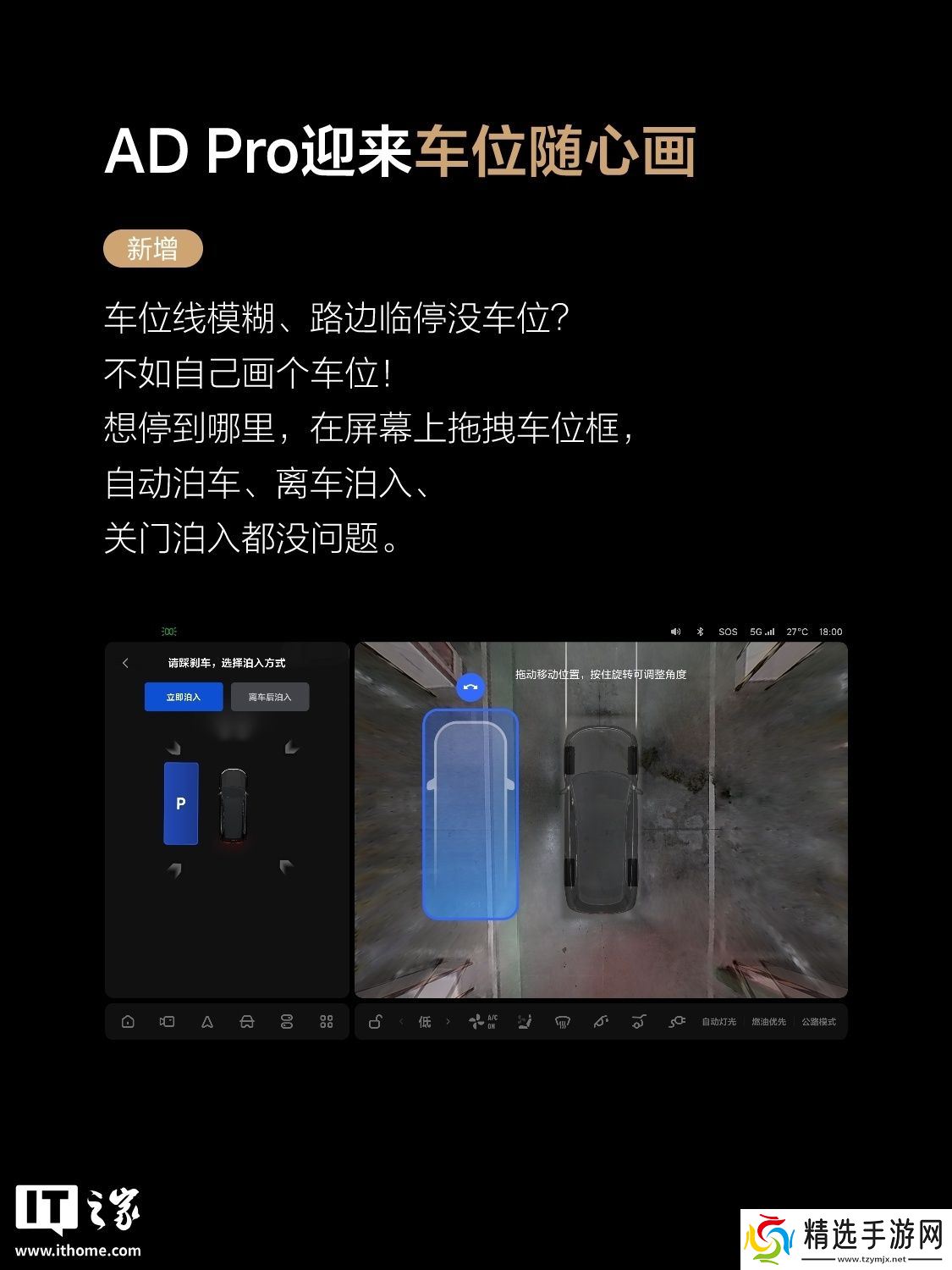 新增的 AD Pro 功能允许用户在屏幕上拖拽车位框,自动泊车、离车泊入、关门泊入都没问题。该功能适用于搭载 AD Pro 辅助驾驶系统的智能焕新版车型。