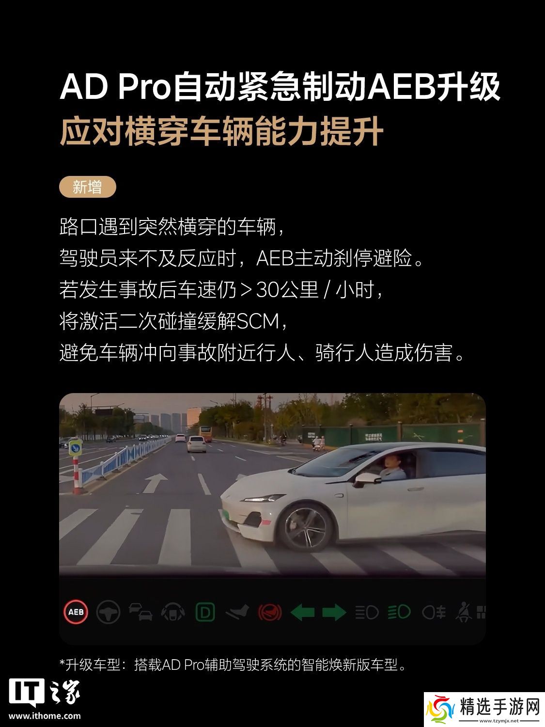路口遇到突然横穿的车辆,驾驶员来不及反应时,AEB 主动刹停避险。若发生事故后车速仍 > 30 公里 / 小时,将激活二次碰撞缓解 SCM,避免车辆冲向事故附近行人、骑行人造成伤害。该功能适用于搭载 AD Pro 辅助驾驶系统的智能焕新版车型。