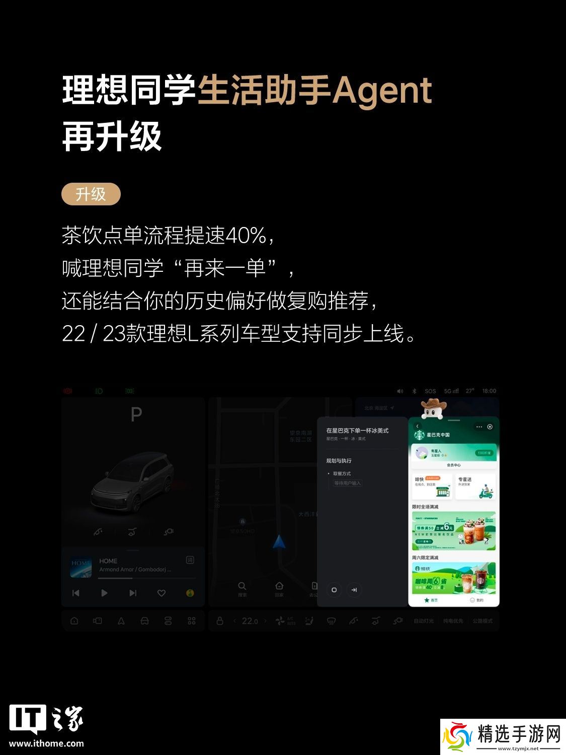 茶饮点单流程提速 40%,喊理想同学“再来一单”,还能结合你的历史偏好做复购推荐,22/23 款理想 L 系列车型支持同步上线。