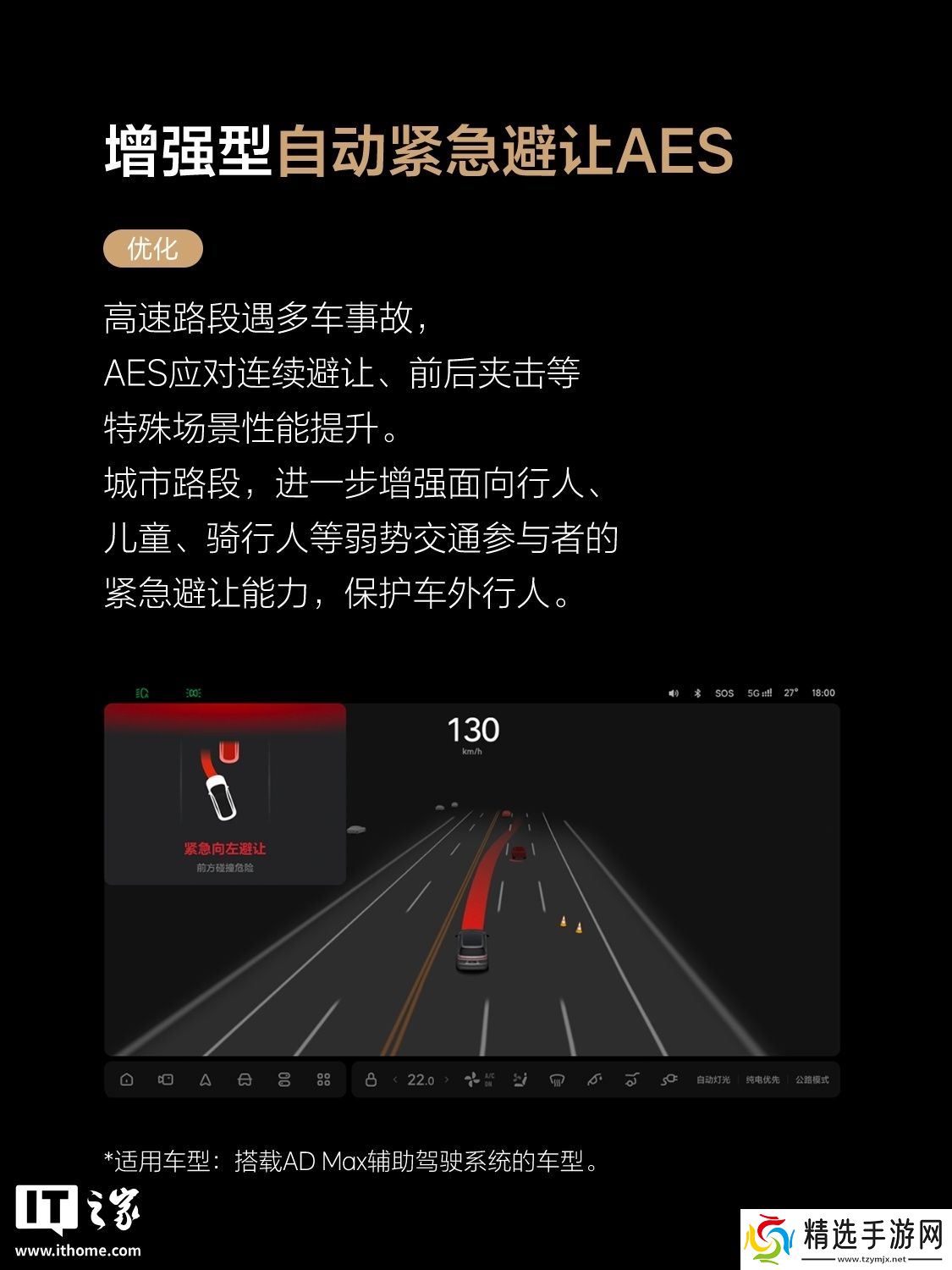 在高速路段遇多车事故时,AES 应对连续避让、前后夹击等特殊场景性能提升。城市路段,进一步增强面向行人、儿童、骑行人等弱势交通参与者的紧急避让能力,保护车外行人。该功能同样适用于搭载 AD Max 辅助驾驶系统的车型。