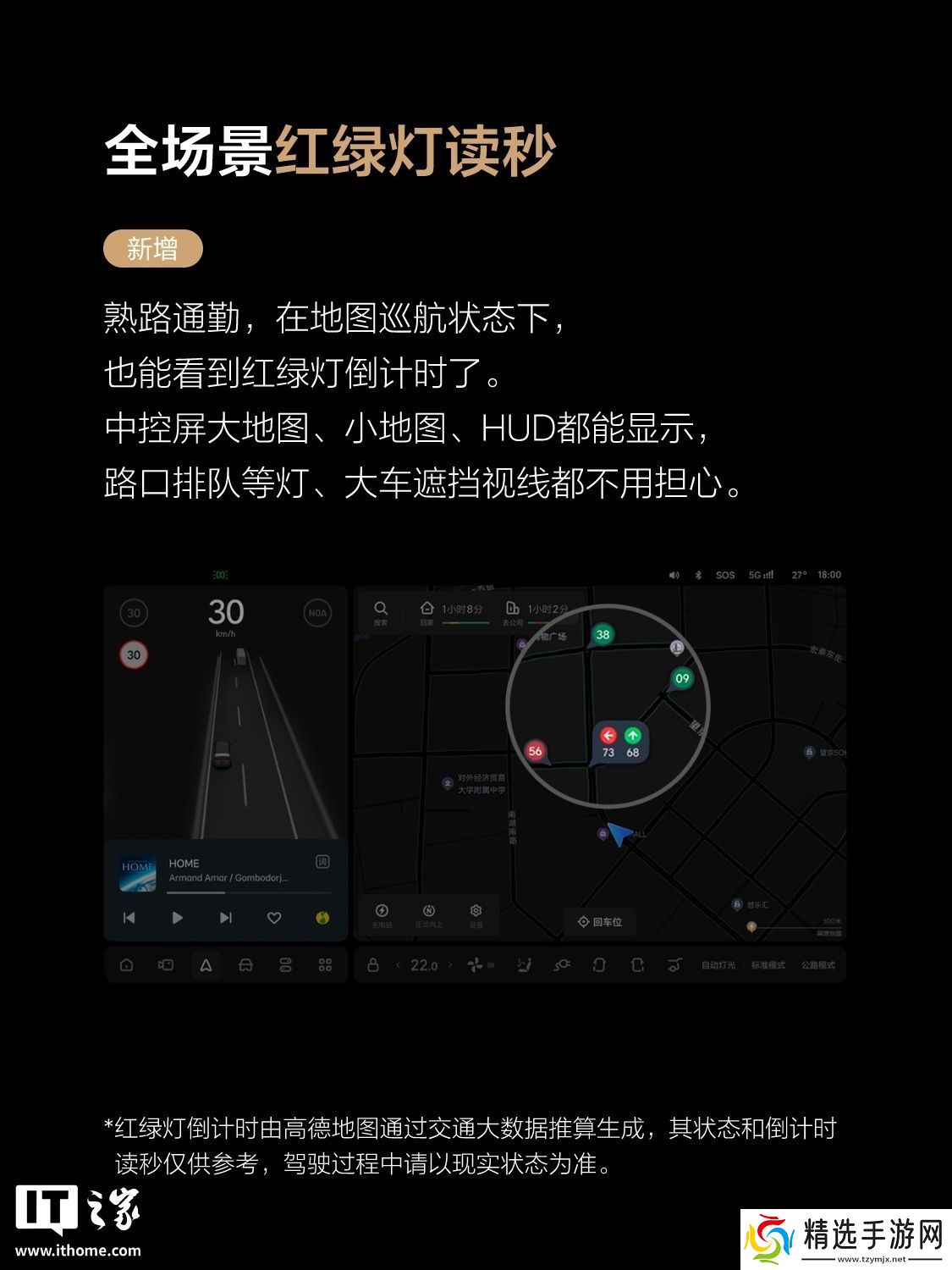新增的全场景红绿灯读秒功能,让用户在地图巡航状态下也能看到红绿灯倒计时。中控屏大地图、小地图、HUD 都能显示,路口排队等灯、大车遮挡视线都不用担心。红绿灯倒计时由高德地图通过交通大数据推算生成,其状态和倒计时读秒仅供参考,驾驶过程中请以现实状态为准。