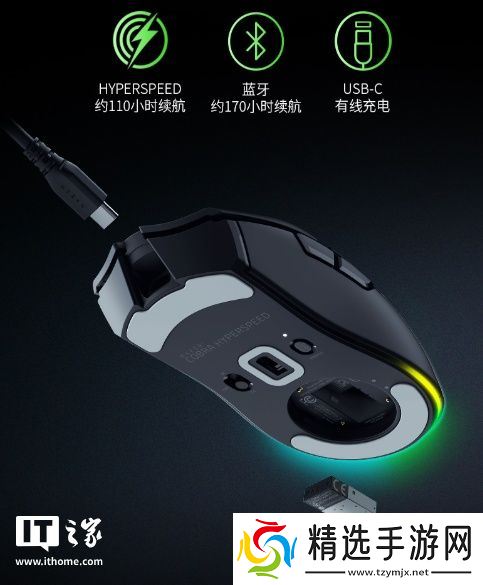 雷蛇眼镜蛇极速版支持 HYPERSPEED(2.4GHz)、蓝牙、USB 有线三种连接模式,底部配备环绕式灯带。