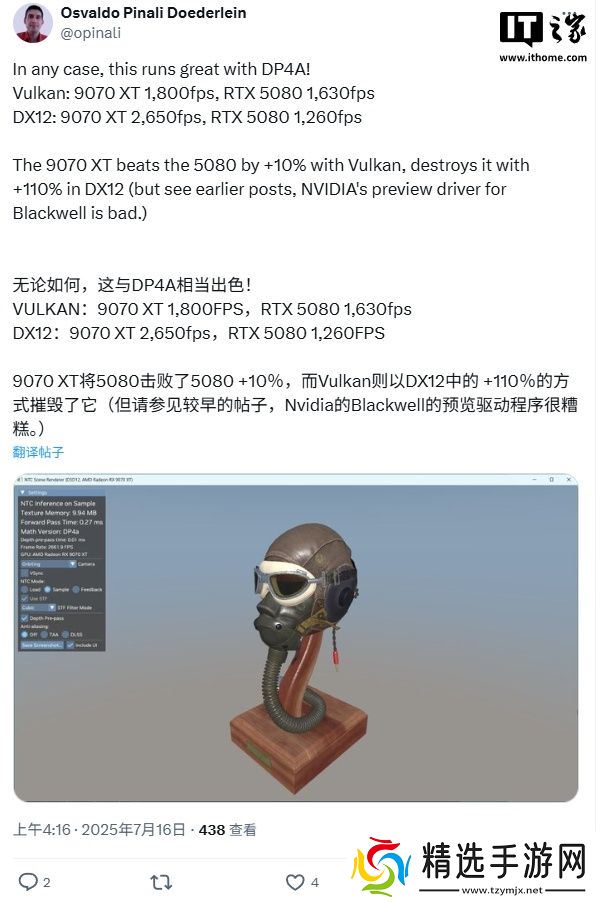 本站 7 月 23 日消息,GPU 规格并非性能的唯一决定因素,驱动与软件优化同样重要。通过优化,AMD Radeon RX 9070 XT 在特定测试场景下展现出超越 NVIDIA GeForce RTX 5080 的性能。