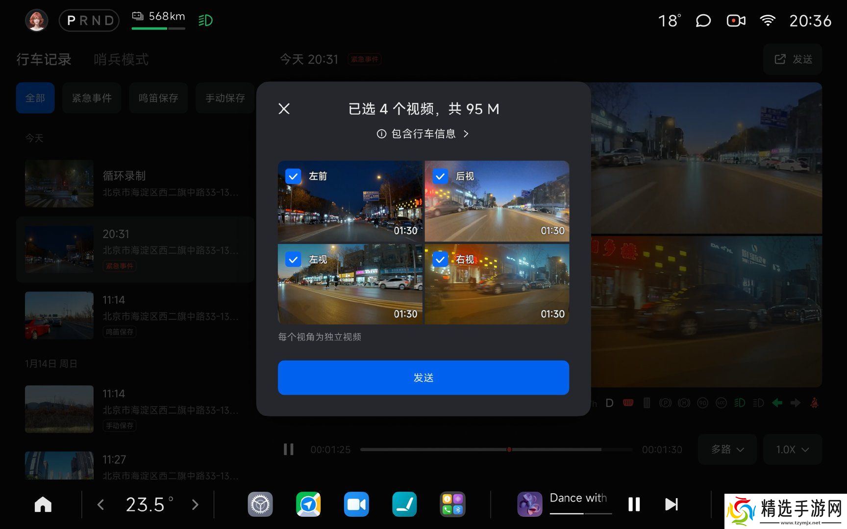 点击右上角的发送,选择您要导出的视频和需要添加的行车信息(如下图所示);