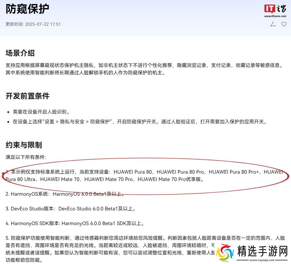 本站查询华为鸿蒙 HarmonyOS 开发者官网的开发文档获悉,“防窥保护”功能支持设备除 Pura80 外,还将支持 Mate 70、Mate 70 Pro、Mate 70 Pro 优享版机型,但系统版本当前限制条件为 HarmonyOS 6.0.0 Beta1 及以上(该文档更新时间为 2025 年 7 月 22 日)。