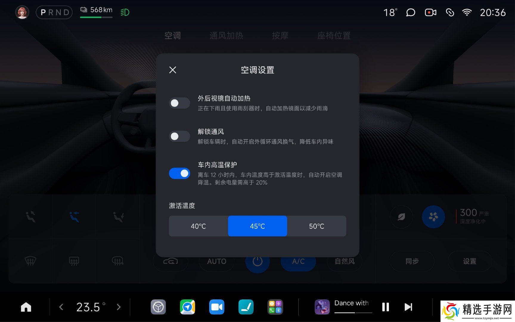 「车内高温保护」:离车 12 小时内,当车内温度高于设定的激活温度,空调将自动开启降温,从而避免因车辆暴晒而引起车内温度过高等情况。