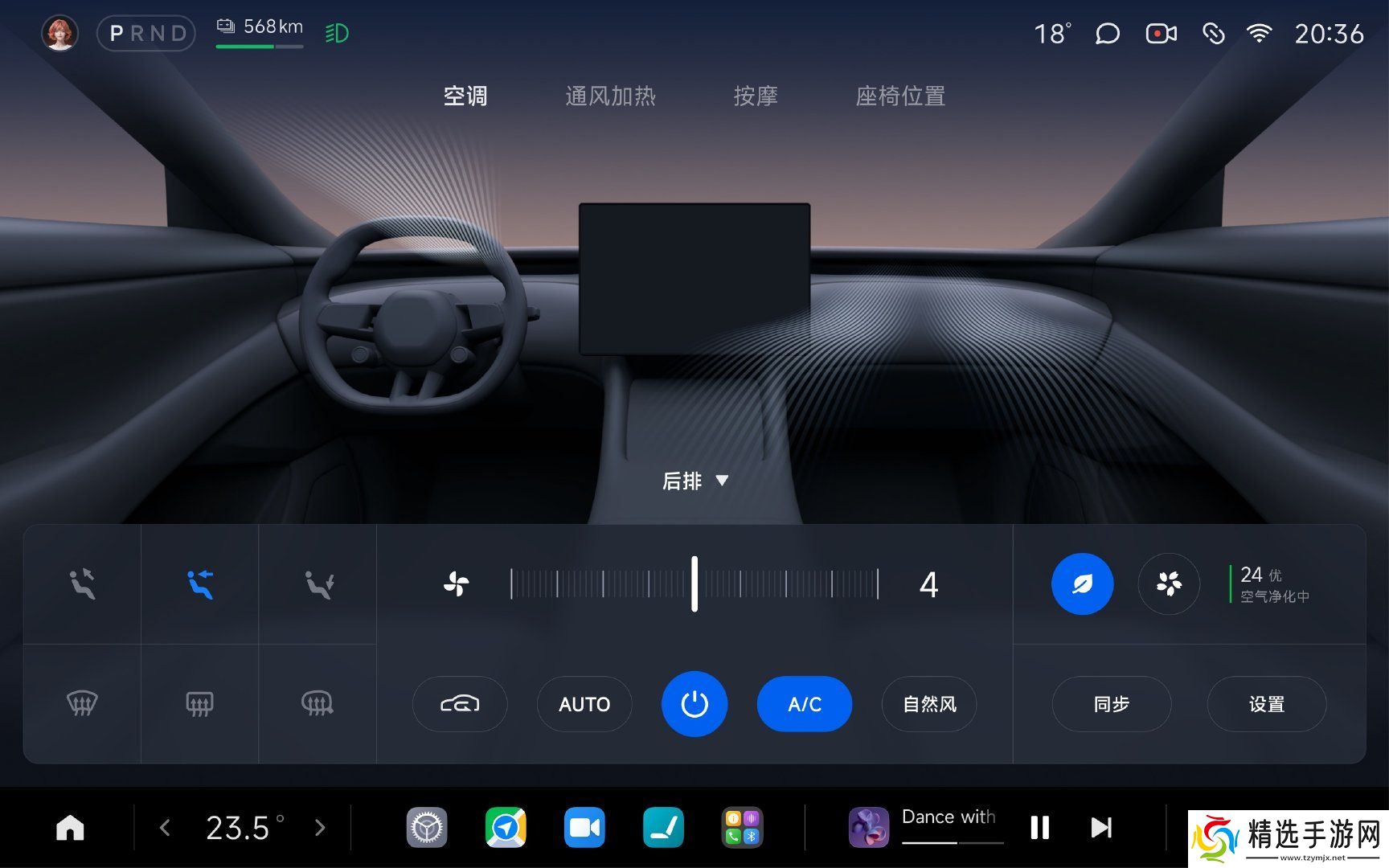 吹风模式设置:在空调主页面,「A / C」右侧是「自然风」模式开关。开启「自然风」模式,车辆前后排空调出风口将自动调节风速,相比普通模式的恒定风速,该模式模拟了大自然吹风的感觉,避免持续大风量直吹带来的不适感。