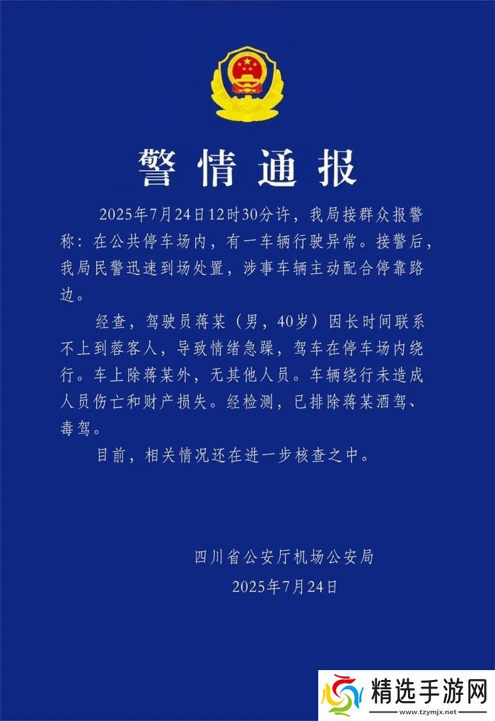 本站 7 月 24 日消息,本站从“四川机场公安”获悉,四川省公安厅机场公安局今晚发布警情通报:7 月 24 日 12 时 30 分许,我局接群众报警称:在公共停车场内,有一车辆行驶异常。接警后,我局民警迅速到场处置,涉事车辆主动配合停靠路边。