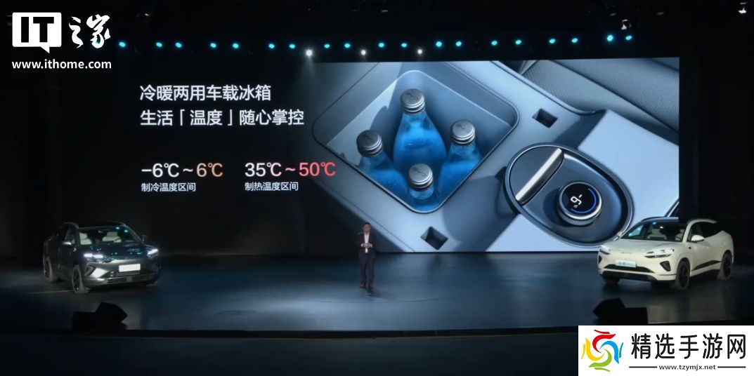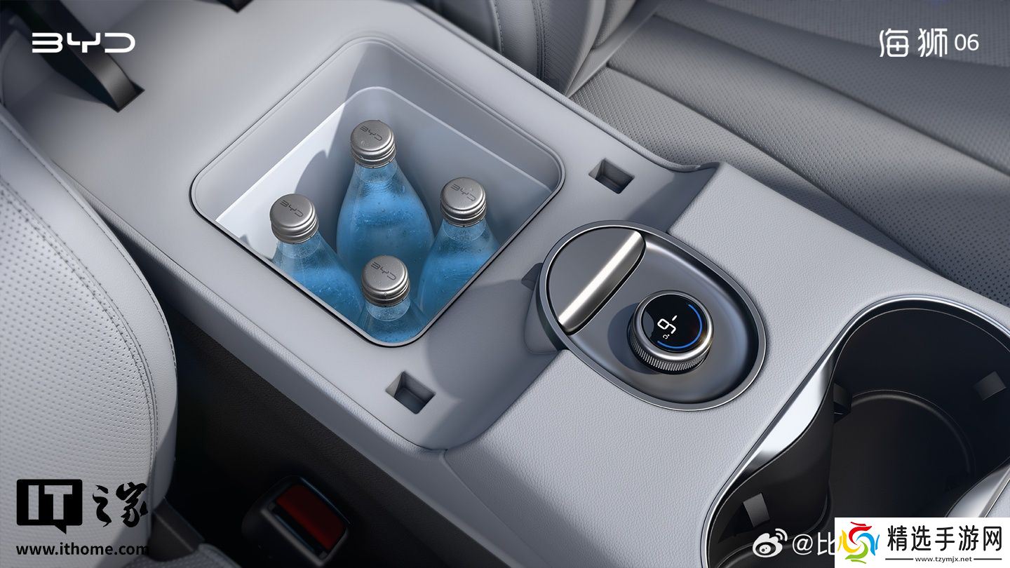 新车还拥有氛围灯、四辐方向盘,扶手箱处提供有车载无线充、杯架,以及压缩机冷暖箱,其中冷暖箱可储存 4 瓶左右的饮品,并采用旋钮调节控温。