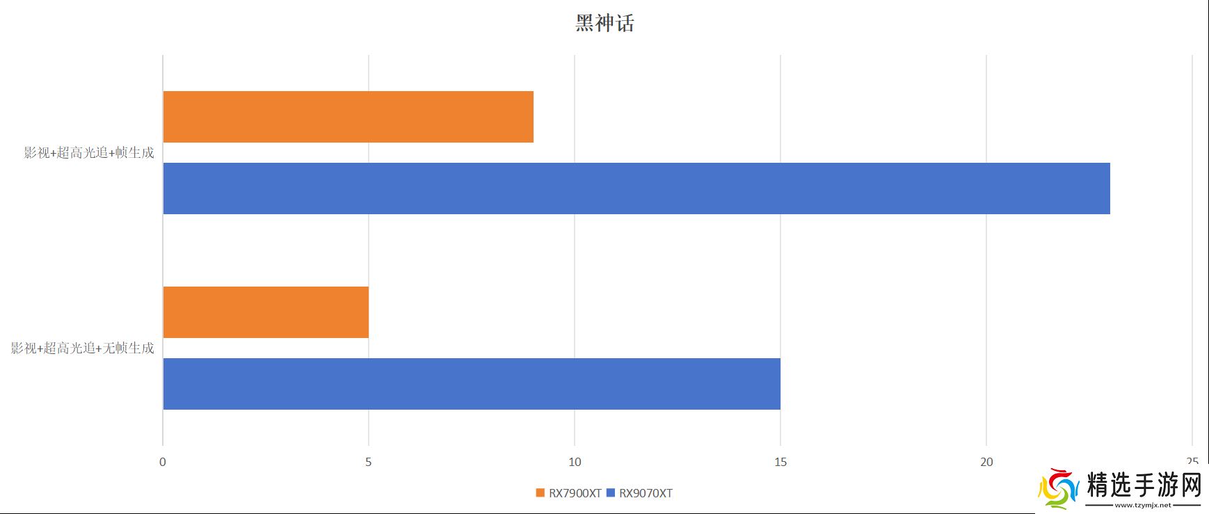在游戏实测中,RX 9070XT同样展现出了强大的性能。在《黑神话:悟空》这款游戏中,RX 9070XT在4K分辨率+超高光追的画质设置下,跑出了平均15帧的成绩,而RX7900XT则仅为5帧。开启帧生成后,RX 9070XT的帧数更是飙升至23帧,接近30帧的流畅标准。这样的性能表现,无疑让AMD显卡在光追游戏领域有了更大的竞争力。