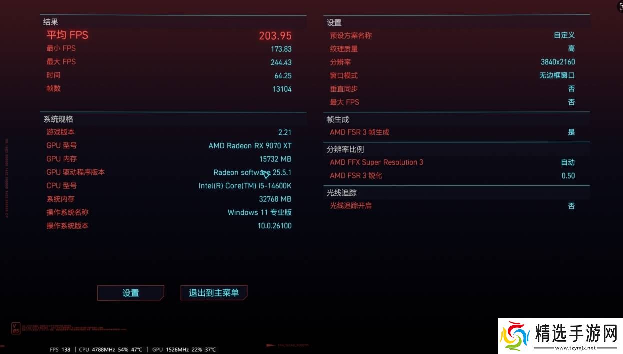 在《赛博朋克2077》这款“显卡杀手”级别的游戏中,RX 9070XT同样展现出了惊人的性能。在特效全高+超速光追的画质设置下,开启FSR3的帧生成,4K分辨率下,RX 9070XT的帧数狂飙至187帧,而RX7900XT则只有47帧。这样的性能差距,让人不得不感叹AMD显卡的进步之大。