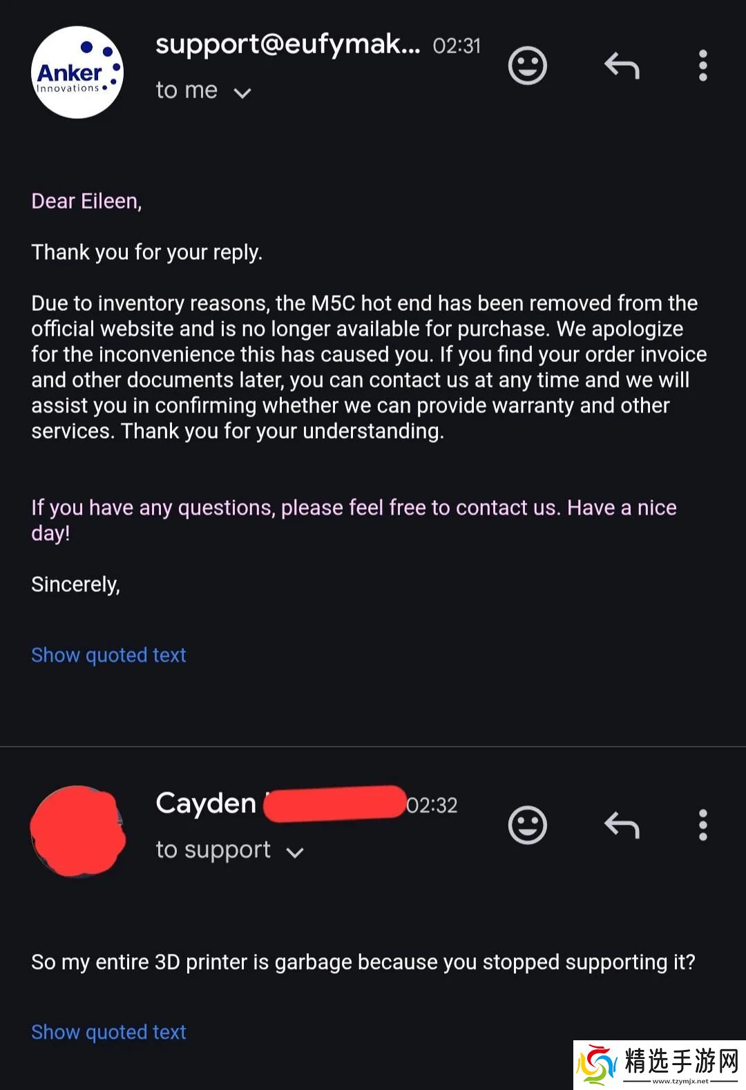 如今,Reddit 上的用户还反映,他们已难以轻松获得 M5C 最关键的零部件 —— 热端,该部件负责熔化并挤出 3D 打印塑料。一份据称是 eufyMake 客服发给某 Reddit 用户的邮件中写道:“由于库存原因,M5C 热端已从官网下架,不再出售。”该用户回复道:“那我的整个 3D 打印机岂不是成了**,因为你停止了对它的支持?”(热端通常是 3D 打印机堵塞时最先需要更换的部件之一。)