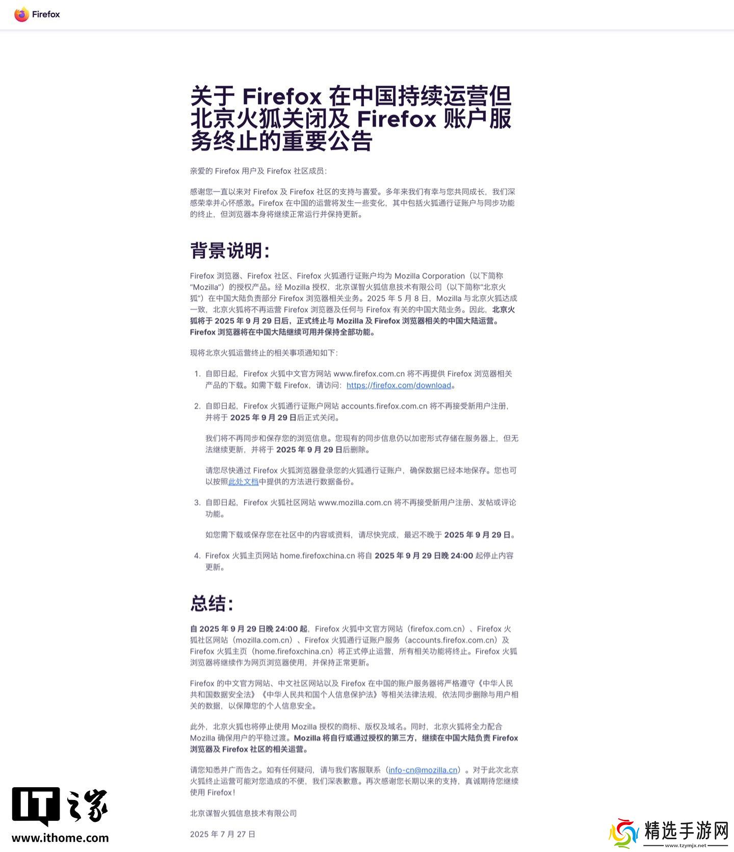 本站 7 月 27 日消息,据 Firefox 火狐浏览器官网,北京火狐将于 2025 年 9 月 29 日后正式终止与 Mozilla 及 Firefox 浏览器相关的中国大陆运营。Firefox 浏览器将在中国大陆继续可用并保持全部功能。